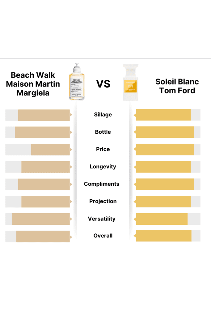 Price is where Beach Walk really shines. As part of the Maison Margiela Replica line, it’s more affordable without sacrificing quality. Soleil Blanc, on the other hand, reflects Tom Ford’s reputation for ultra-luxury pricing, making it a significant investment. If you’re looking for a summer scent on a budget, Beach Walk is the better choice.