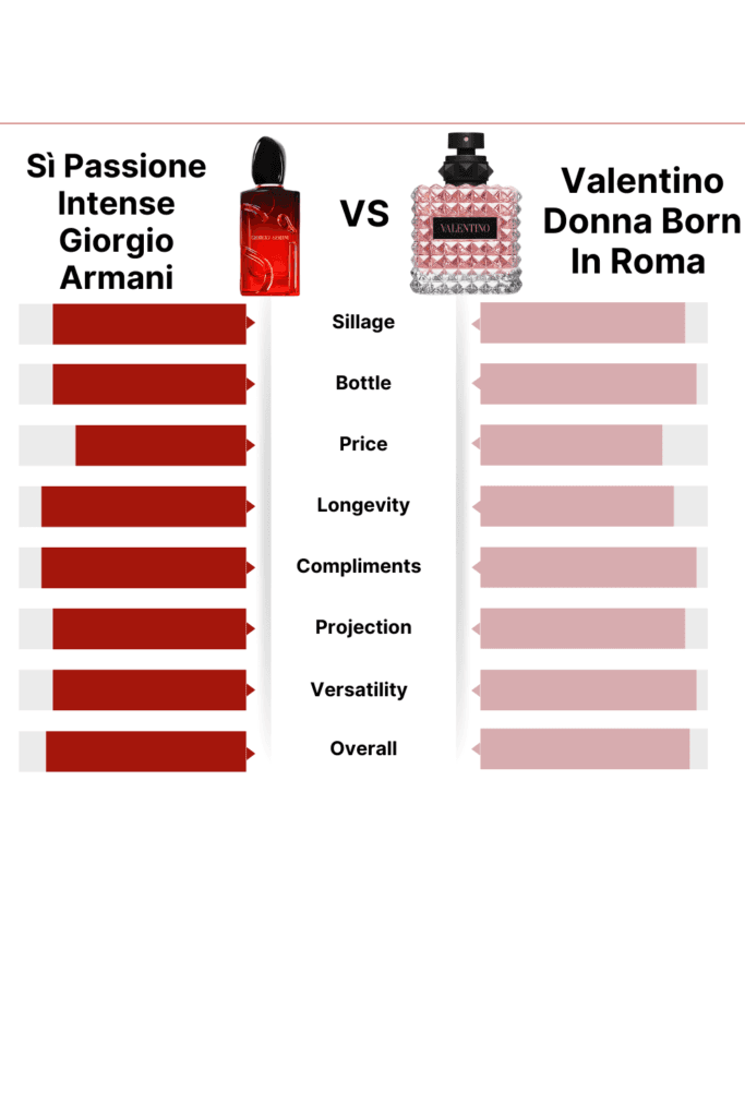 When it comes to sophisticated, feminine fragrances, Sì Passione Intense 2024 by Giorgio Armani and Valentino Donna Born In Roma are two of the most sought-after options in the market. These perfumes exude elegance, charm, and versatility, but how do they compare in terms of performance, appeal, and value? This detailed breakdown will help you choose the perfect scent for your style. Plus, we’ve included links to buy your favorite fragrance at the end!